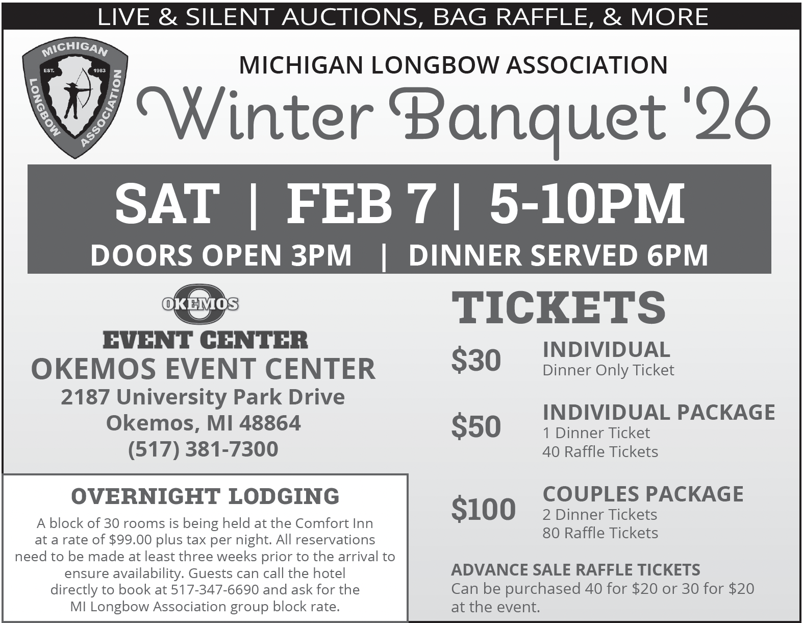 Come join us to celebrate the longbow, participate in our raffles and auction, and acknowledge the accomplishments of our members in 2023. This is a can’t miss event with all of the MLA family.